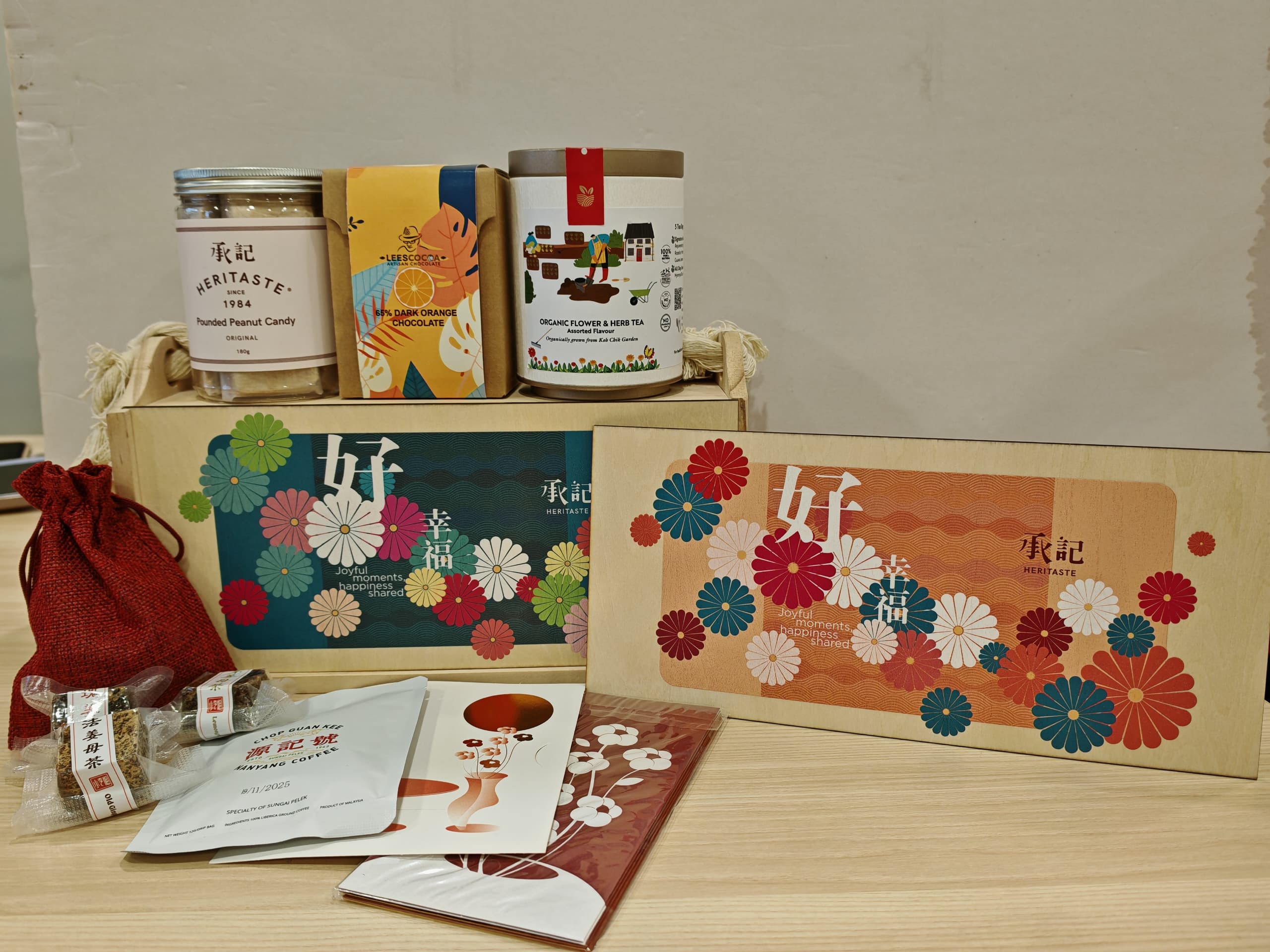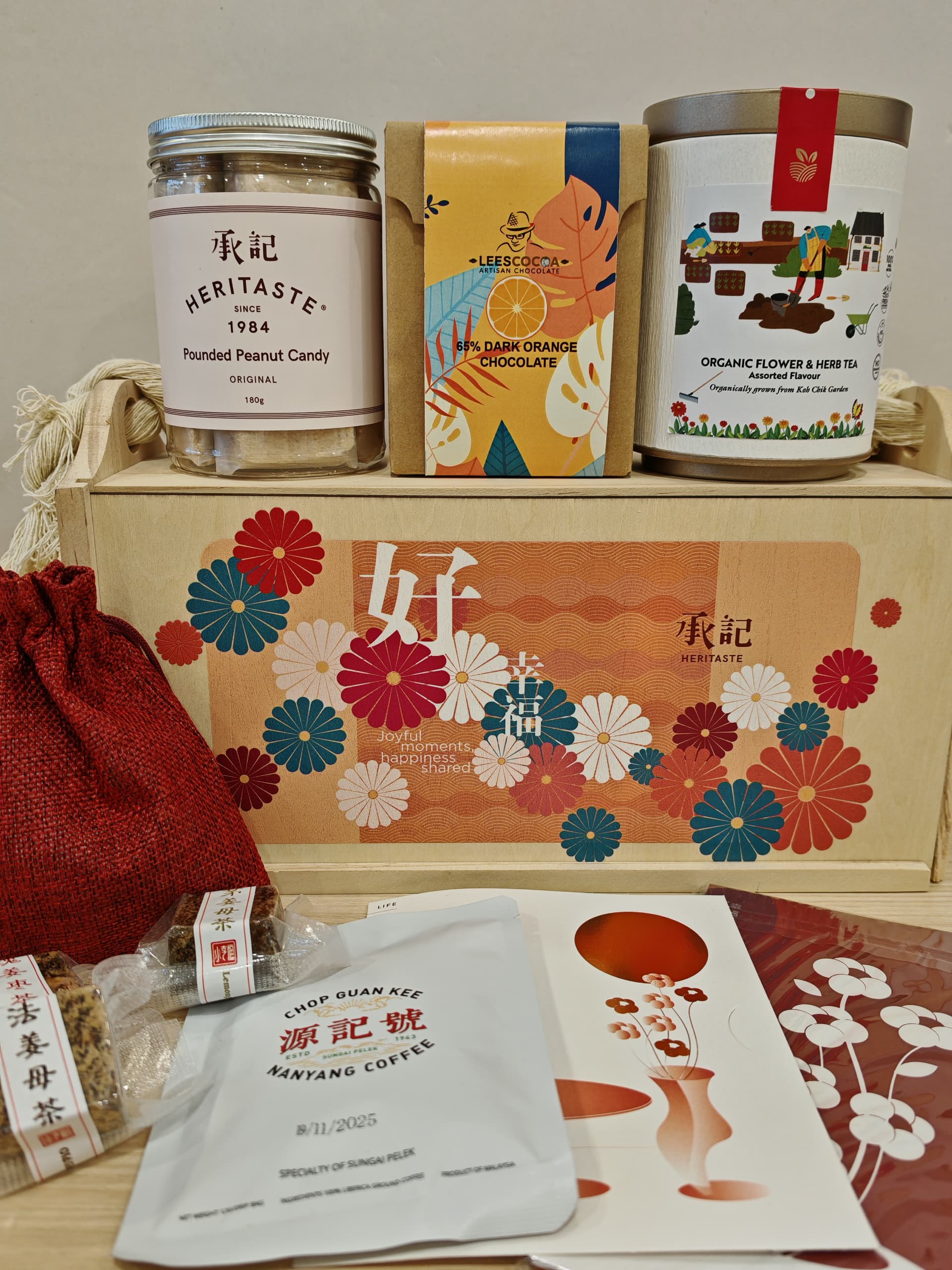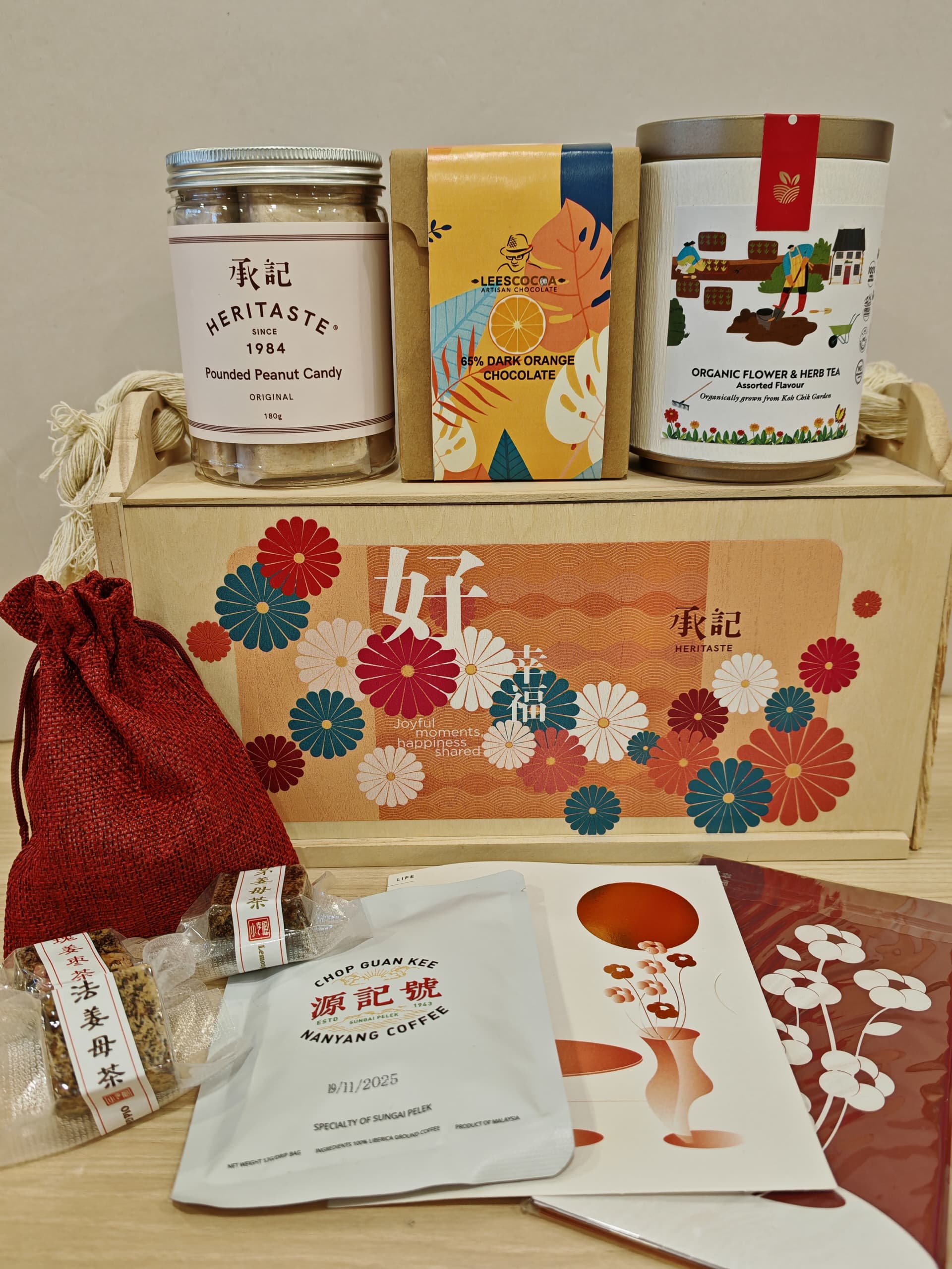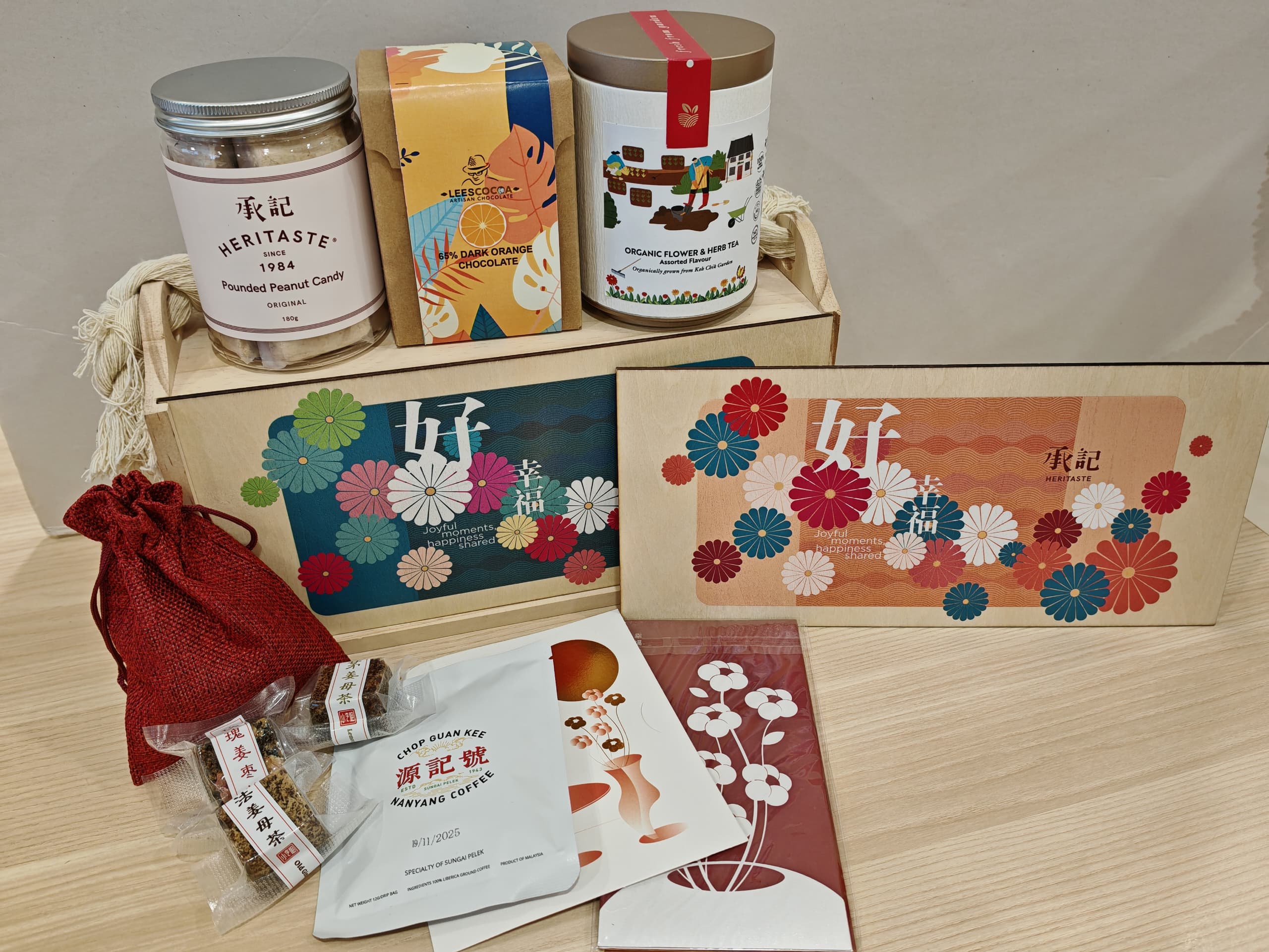 2.五味如歌 -全部手作的产品,适合一家老小的礼盒。 -里面产品:贡糖,巧克力,花茶,红糖姜母茶,Liberica Coffee.